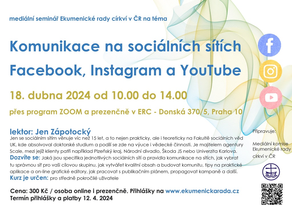 Srdečně Vás zveme na mediální semináři s Jenem Zápotockým na téma Komunikace na sociálních sítích Facebook, Instagram a YouTube.