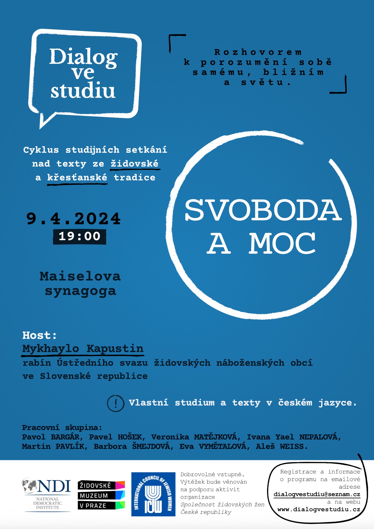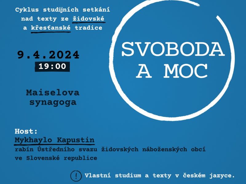 Další studijní setkání ze série Dialog ve studiu (cyklus studijních setkání nad texty ze židovské a křesťanské tradice). Tentokrát s tématem Svoboda a moc - 9. dubna 2024 od 19:00 v Maiselově synagoze.