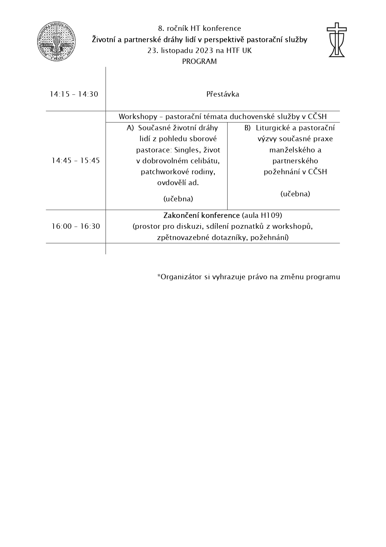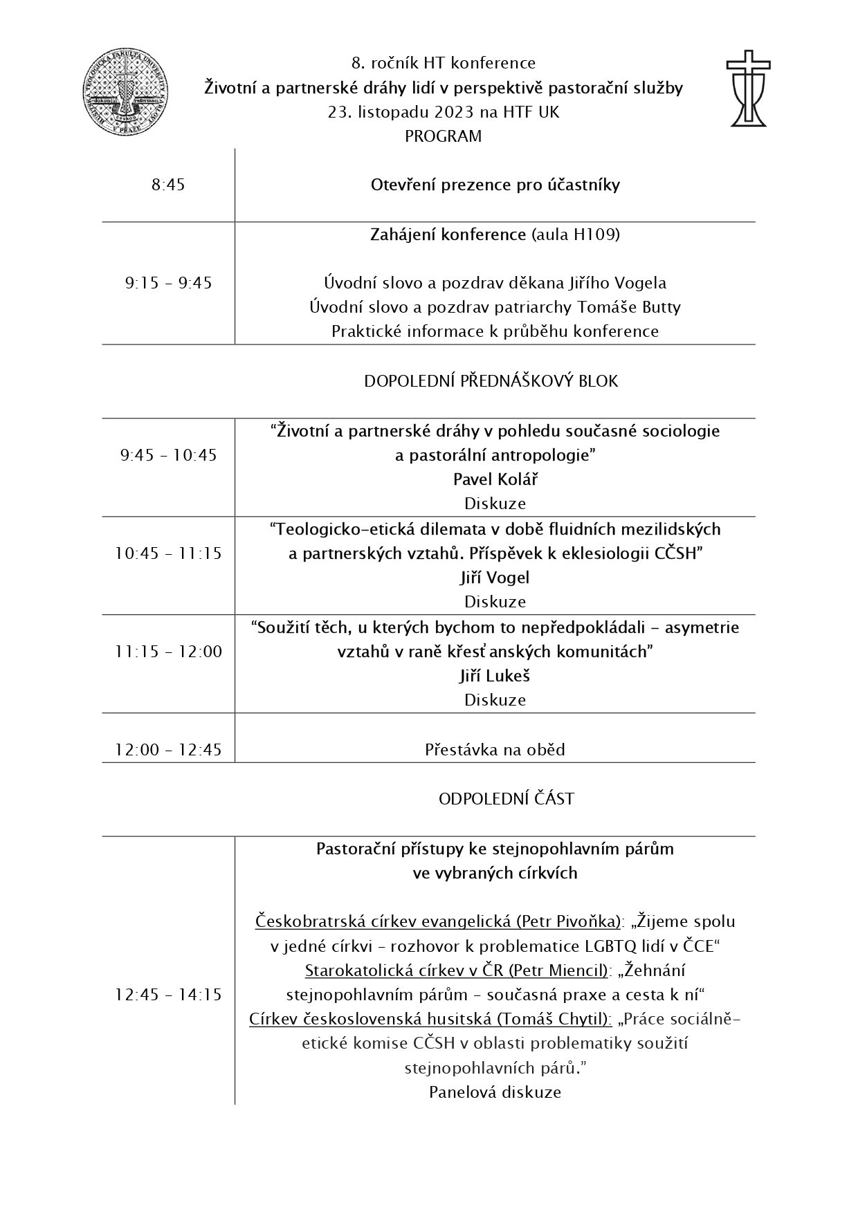 Srdečně vás zveme na další ročník, tentokrát s tématem "Životní a partnerské dráhy lidí v perspektivě pastorační služby" konané ve čtvrtek 23. listopadu 2023 na HTF UK.