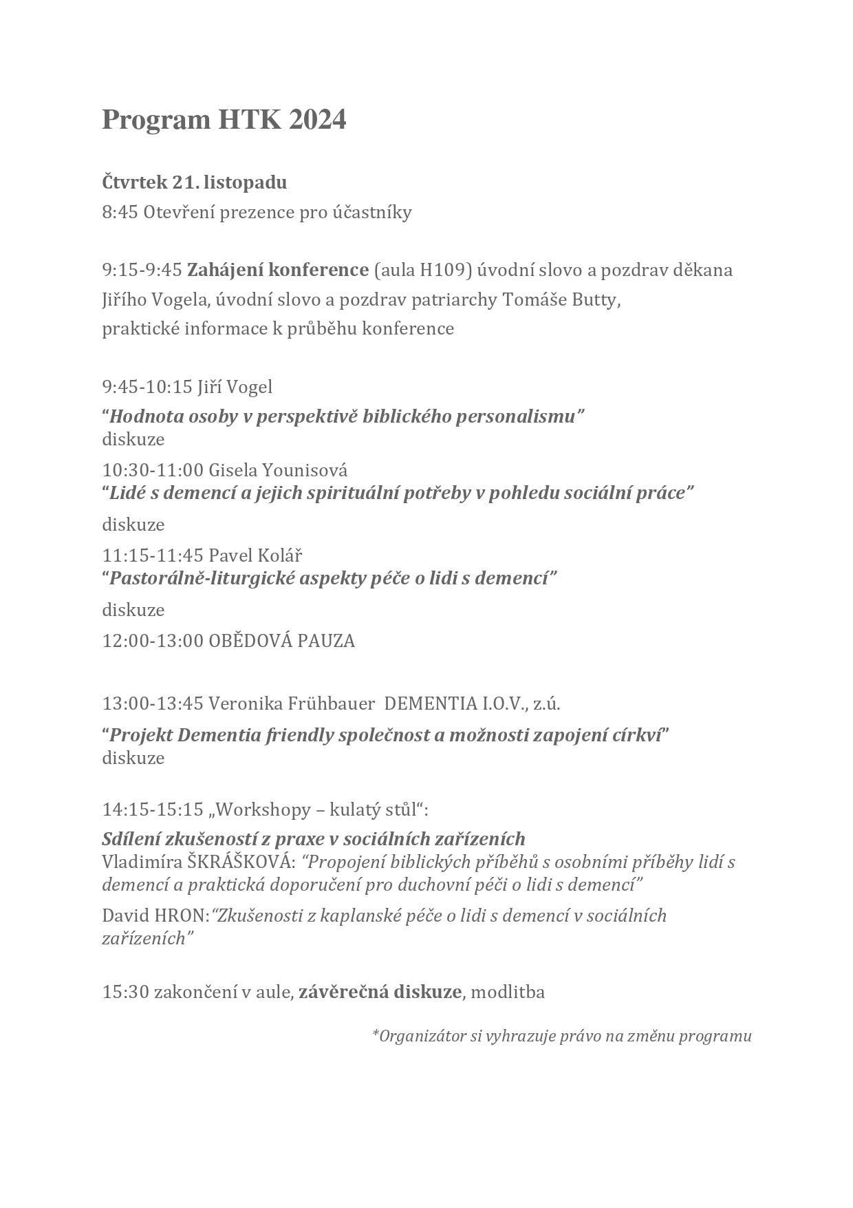 Neurodegenerativních a psychických poruch ve stáří ve společnosti se zvyšujícím se věkem dožití přibývá, je to všeobecné a aktuální téma. Dotýká se i oblasti spirituality. Proto se této problematice věnoval devátý ročník konference, která se konala na Husitské teologické fakultě UK pod názvem Duchovní péče o lidi s demencí.