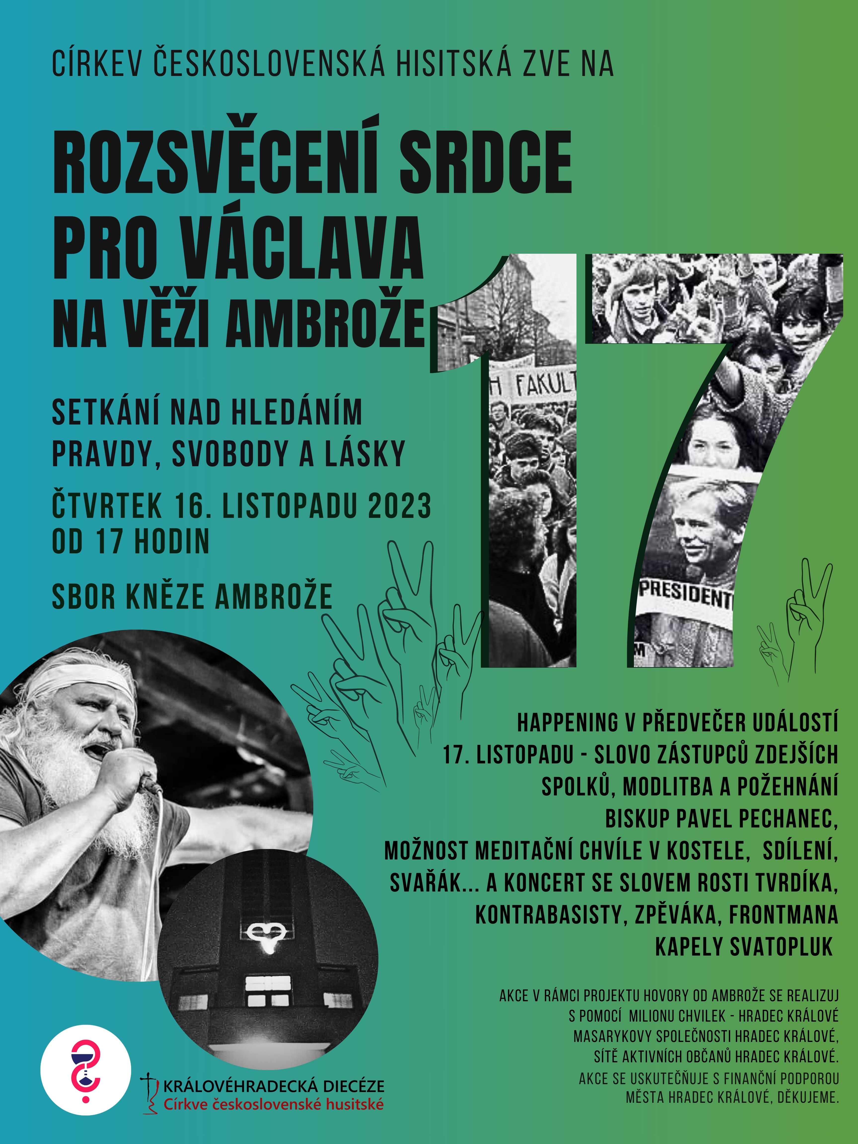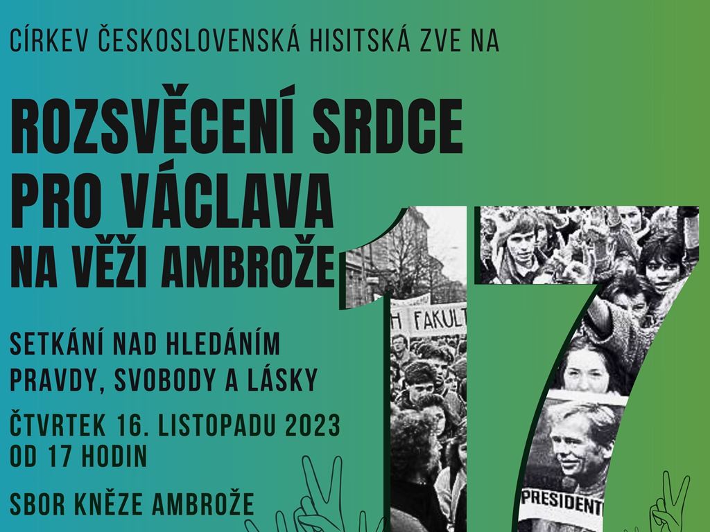 Církev československá husitská Vás zve na Rozsvěcení srdce pro Václava na věži Ambrože - setkání nad hledáním pravdy, svobody a lásky – 16. 11. 2023 od 17 hodin ve sboru kněze Ambrože.