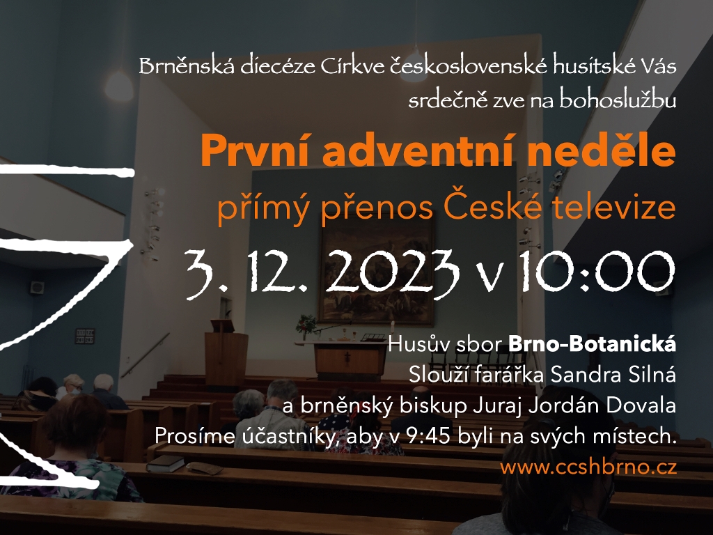 V neděli 3. 12. 2023 od 10 hodin vysílá Česká televize na 2. programu přímý přenos liturgie 1. neděle adventní z Husova sboru v Brně na Botanické ul.