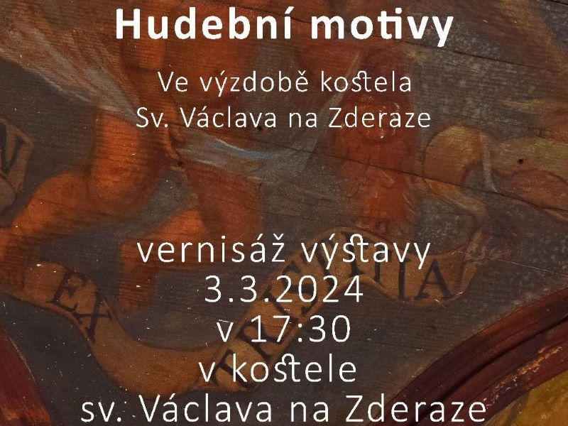 Výstava k Roku české hudby bude ke zhlédnutí v kostele sv. Václava na Zderaze. Barevnými fotografiemi přiblíží malby na jižní části kazetového stropu pod kůrem, které jsou věnovány hudbě a její roli v Písmu svatém. Autory maleb jsou augustiniánští mniši v době, kdy byl kostel součástí augustiniánského kláštera. Biblické scény na malbách vyfotografoval a výstavu připravuje fotograf MgA. Ladislav Hovorka. Vernisáž výstavy bude v neděli 3. března 2024 v 17.30 hod. Kostel je pro běžné návštěvníky otevřen každé úterý a čtvrtek od 13.00 do 17.00. Výstavu lze samozřejmě také shlédnou před bohoslužbou či po bohoslužbě nebo po domluvě.
