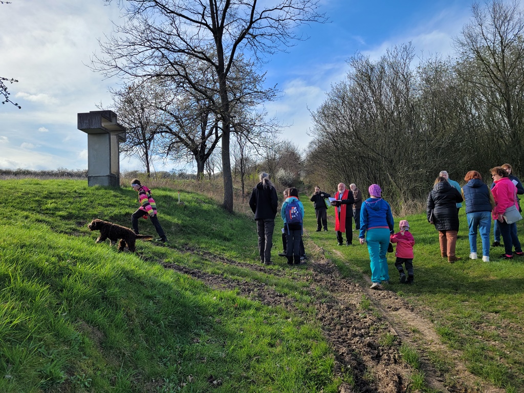 Náš nevelký zástup kráčel do mírného kopce od zastavení k zastavení. Zazněla píseň, byl přečten biblický oddíl. Postupně se odvíjel průběh strastiplné Spasitelovy cesty. Atmosféra naší pouti postupně zvážněla. Děti zapalovaly ke každému kříži svíčku. Kdosi se opozdil, aby se mohl na chvíli posadit uvnitř kříže a zůstat v tiché meditaci. Jen ptáci nad hlavami a rozkvetlé stromy všude kolem jakoby už znaly celý velikonoční příběh – jeho radostný závěr.