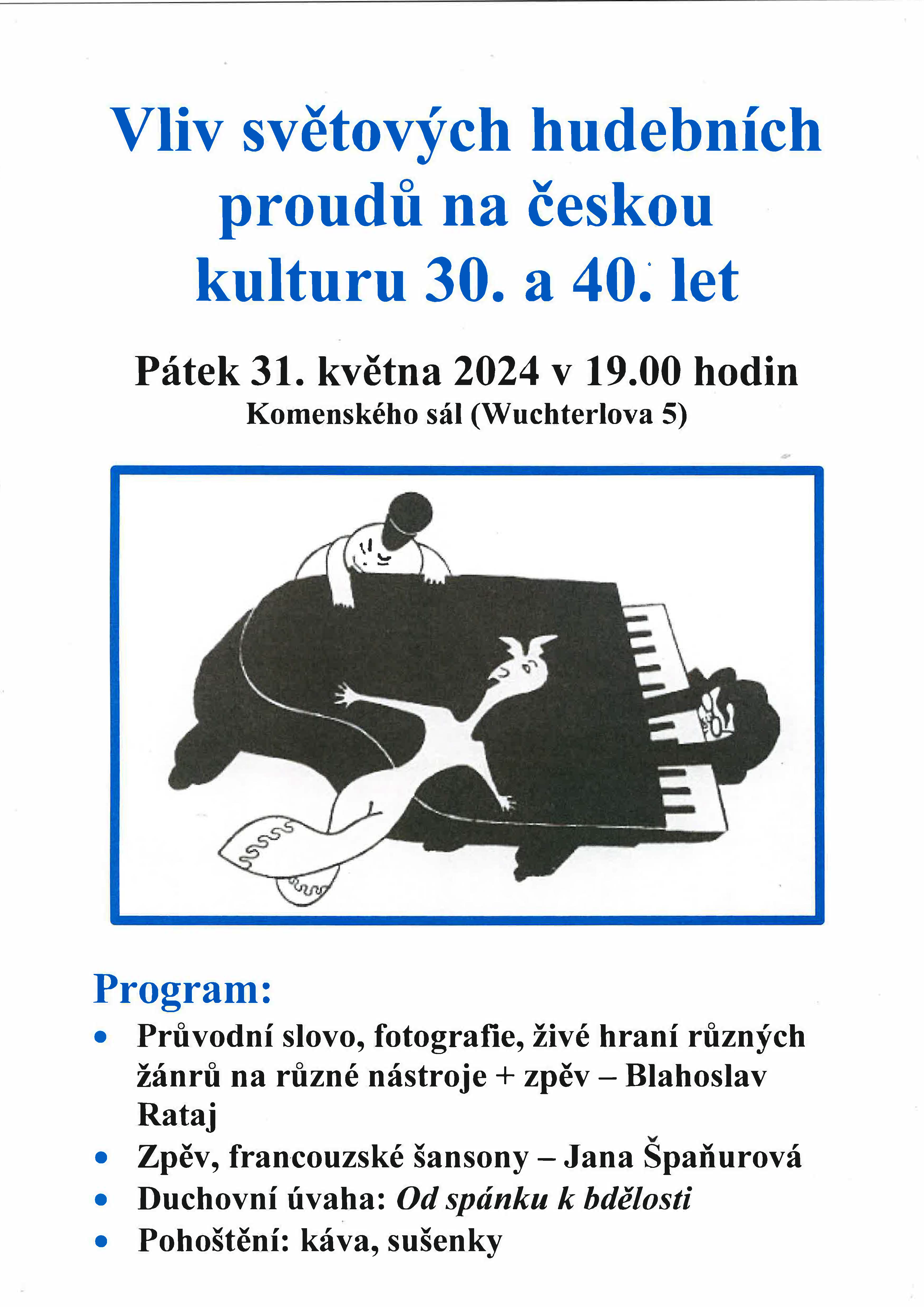 Srdečně zvema na komponovaný večer v Husově sboru v Praze 6-Dejvicích s tématem "Vliv světových hudebních proudů na českou kulturu 30. a 40. let".