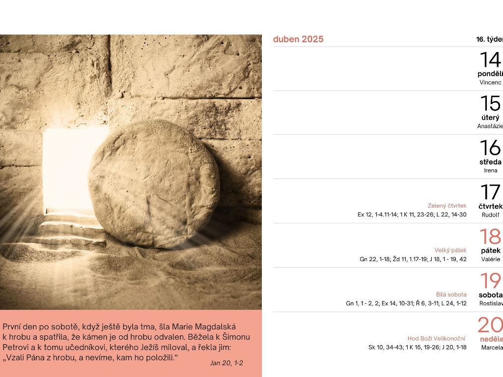 Kalendář je celobarevný, formát A5, vazba spirálová. K dostání v sekretariátu KH diecéze, tel. 608 404 746, více info na www.ccshhk.cz. Kalendáře také k dostání v prodejně Blahoslav v Praze.