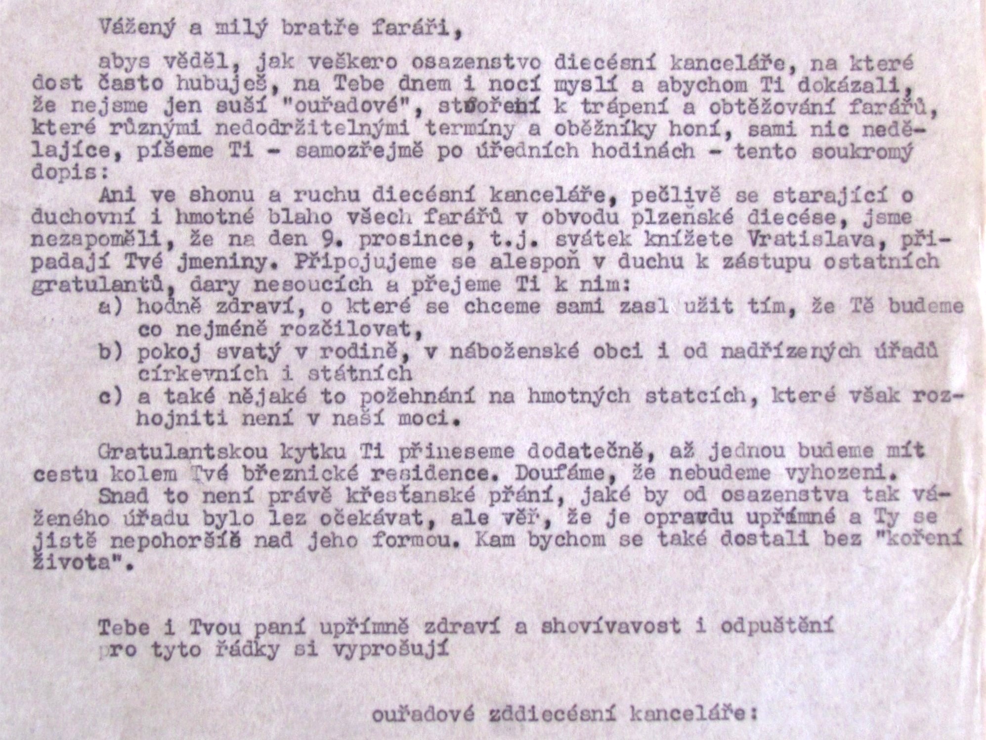 „Velební přátelé, děkuji srdečně za překvapivou a prudce elegantní gratulaci. Začínám být přesvědčen, že jsem v diecézi „někdo“. Pokud se týče odkazu na Dobrovského, dovoluji si upozornit, že jde o Váš malý etymologický omyl, ježto staročeský ‚Žleb‘ neznamená v novočeštině ‚žlab čili jesličky‘, nýbrž zcela prozaické koryto. Račte použít publikaci dr. M. Kaňáka ‚Dějinně hnací elementy duchovenských koncepcí od Karla IV. do vzniku CČS‘ (str. 68), kde naleznete mezi jiným:…‘lidé ohavní (t. j. do hávu, taláru oblečení) zmocnili se už v dobách dřevních fortely všelikými tučných far a prebend, ačkoliv nemálo z nich před tím v žlebech skalních a roklinách se ukrývali, a odtud mnohá lotrovství nadřízené vrchnosti církevní i říšské na potupu řádu dobrého provozovati se jali.‘ A náš učenec pokračuje:… ‚a tak žleby kamenné za koryta mastná vyměnili, což nyní bíledně na mnohých místech se spatřuje.‘ Z čehož následuje, že já jakožto žlebák (M. Čech se narodil ve Žlebech – pozn. autora) pochytil jsem sobě to nejtučnější koryto v diecézi tady pod Kletí, budě tím obecnou závist u nebohých diecézanů, odsouzených bídně živořit kol čadivé svíčky v nehostinné Plzni. A tak ještě jednou Vám všem dík. Na oplátku přeji i já Vám, abyste měli své příští narozeniny zrovna takové, jaké jsem měl letos já. Vám všem bez rozdílu oddaný jubilant Čech“