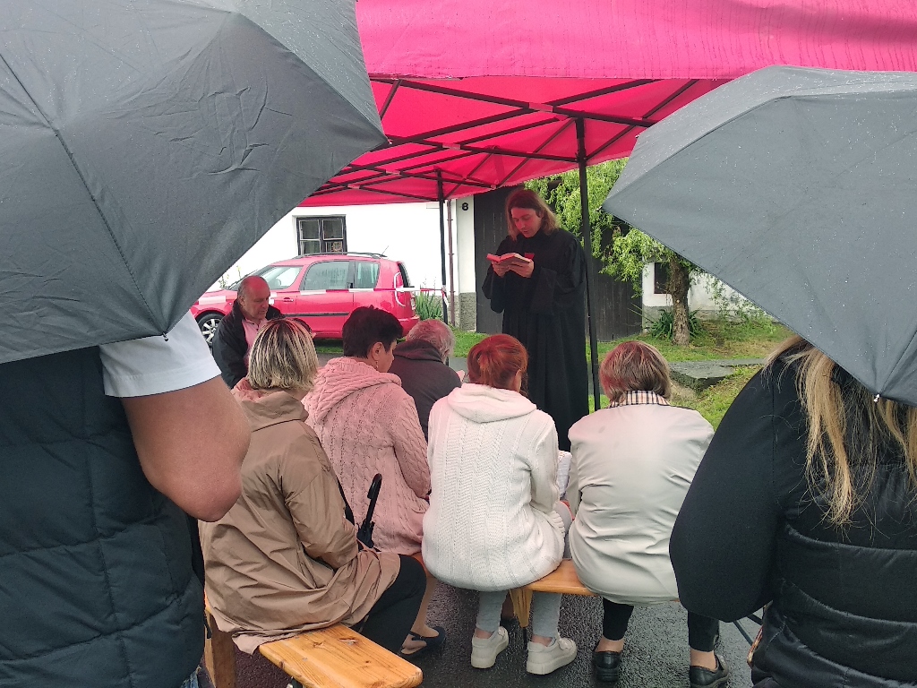 Větru dešti dávno neporoučíme – i tak jsme jim poroučeli leda v budovatelských písních, takže od předešlého večera neustupující trvalý déšť samozřejmě bohoslužbě až tak nepřál. I když se zde neshromáždily davy jako někde na Velehradě nebo v Medžugorje, počet účastníků vzhledem k počasí předčil očekávání a dle ohlasů přítomných lze předpokládat, že za rok bude bohoslužba mít větší návštěvnost a náves bude v případě nepřejícího počasí v duchu skladby nebožtíka Mariana Vargy deštníků a plášťov do dažďa ještě plnější.