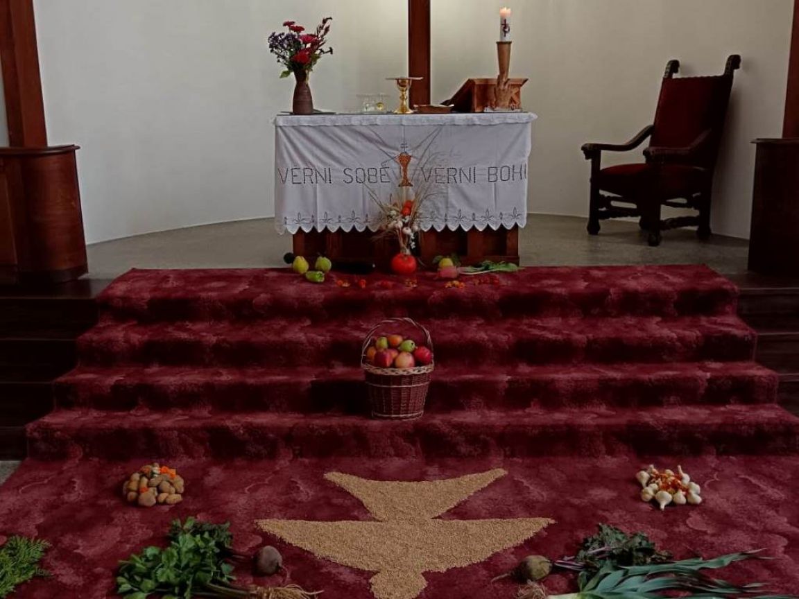 Bohoslužba s díkůvzdáním za úrodu s poděkováním za osm let služby farářky Anny Holínské.