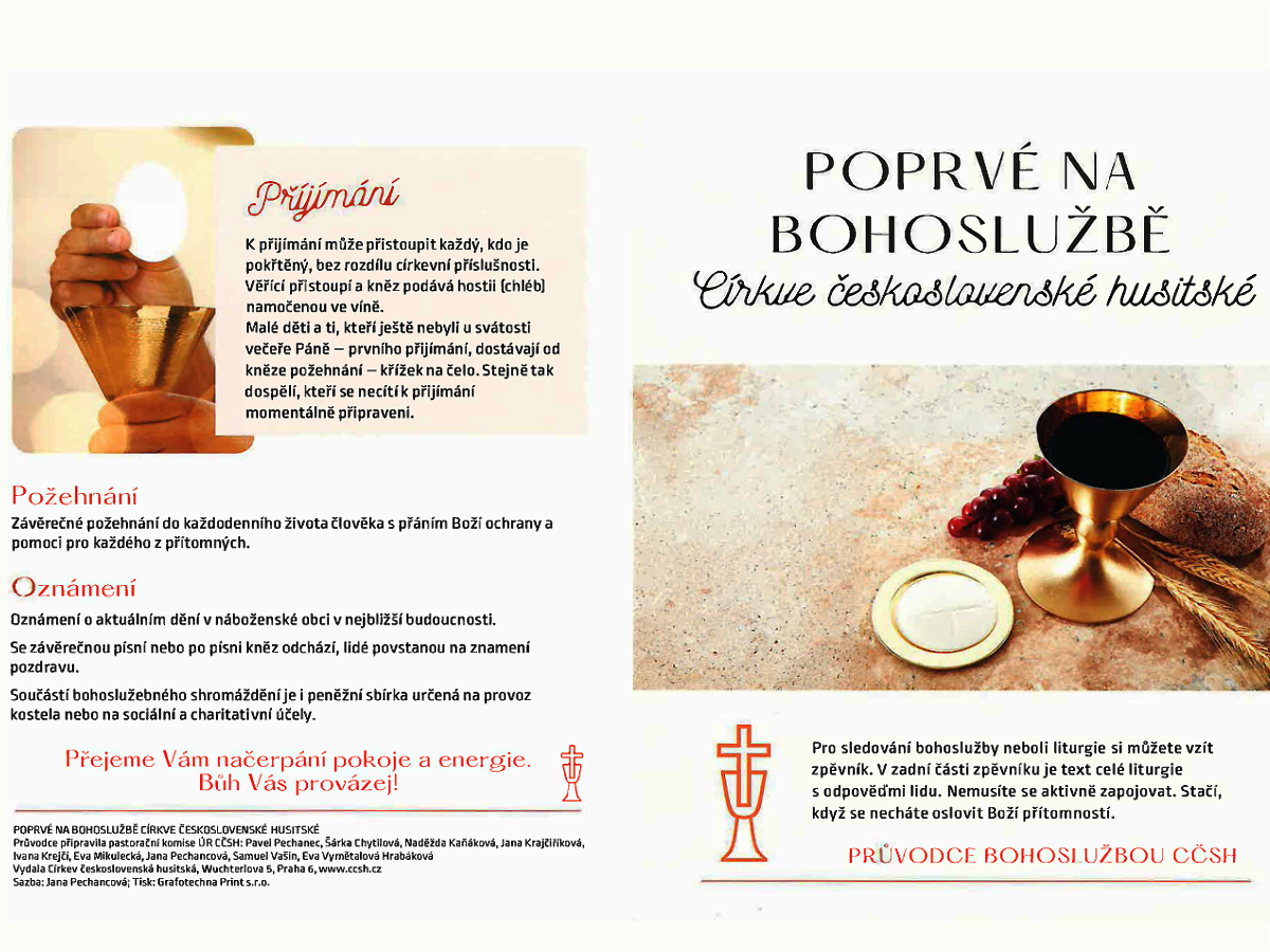 Aby se tyto situace omezily, rozhodla se členka pastorační komise sestra Šárka Chytilová sestavit podklady pro bohoslužebný život ve své náboženské obci. Zaměřila se na nově příchozí a opakované nováčky a vytvořila pro ně stručného průvodce naší jedinečnou, ale pro „nepoučené či nezasvěcené“ náročnou bohoslužbou. Přeložený leták A4 Poprvé na bohoslužbě Církve československé husitské uvádí přehledně a srozumitelně všechny návštěvníky bohoslužeb do liturgického prožitku. Bohoslužební „prvňáčci“, ale i příslušníci jiných křesťanských církví, stejně jako vzrostlejší děti, doprovodné slovo uvítají.