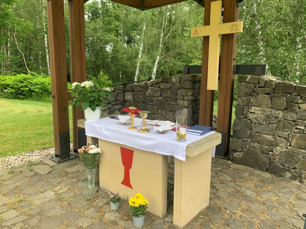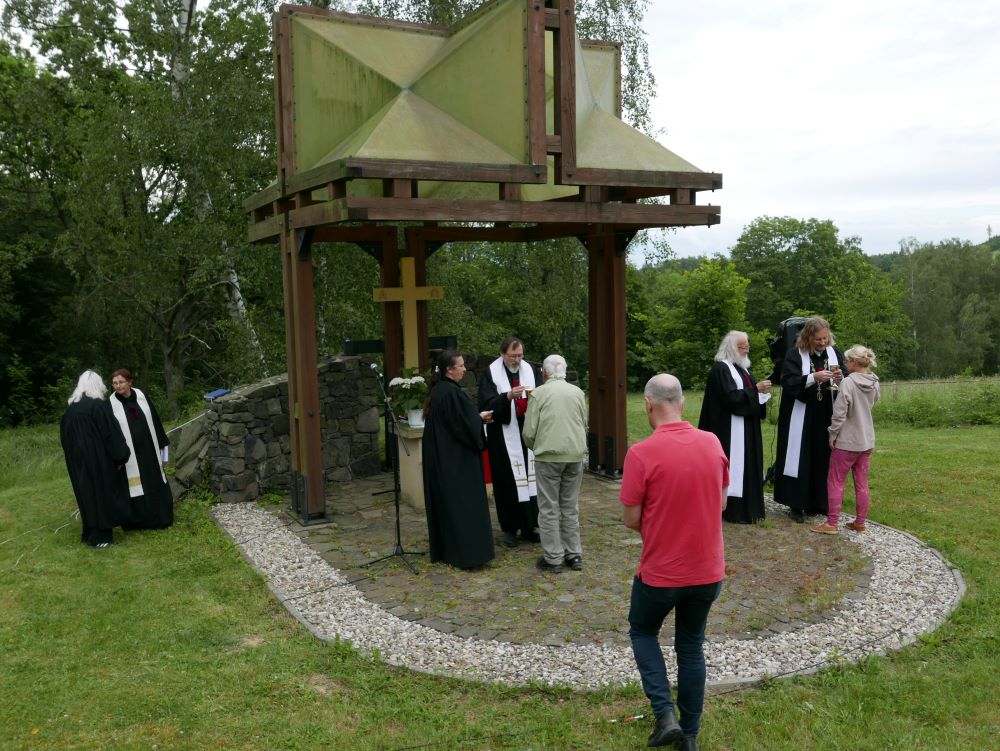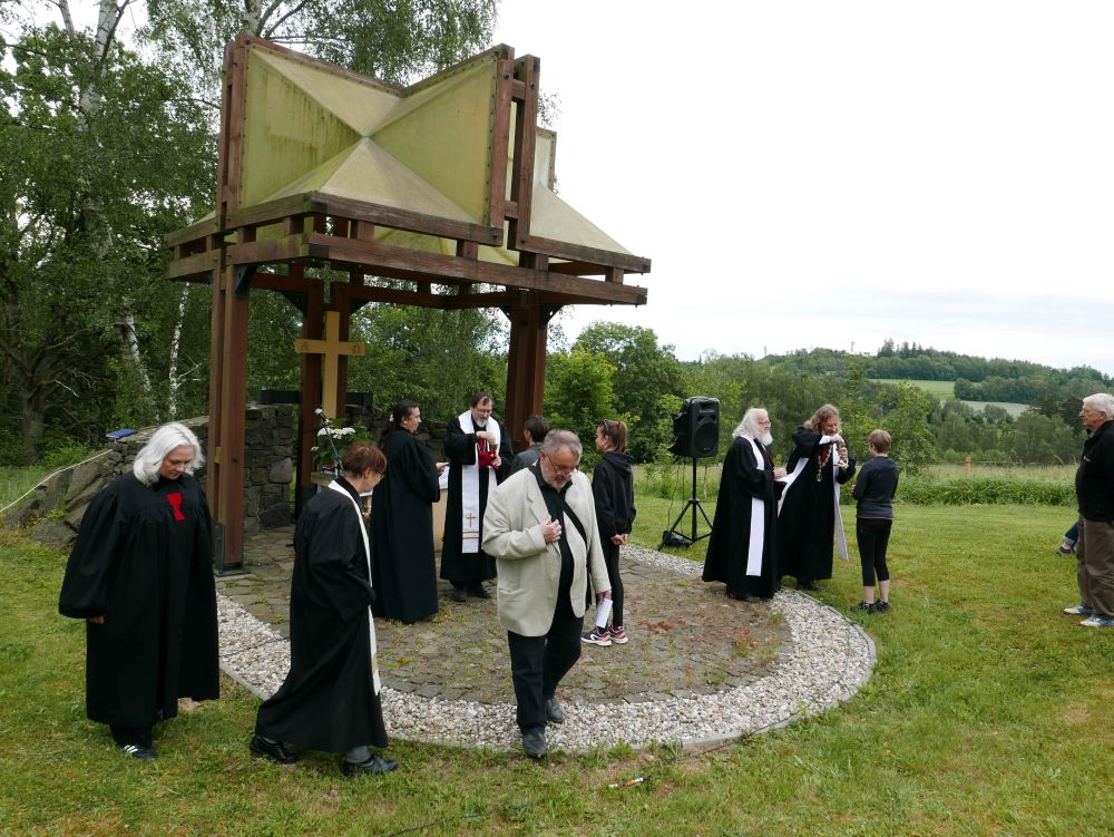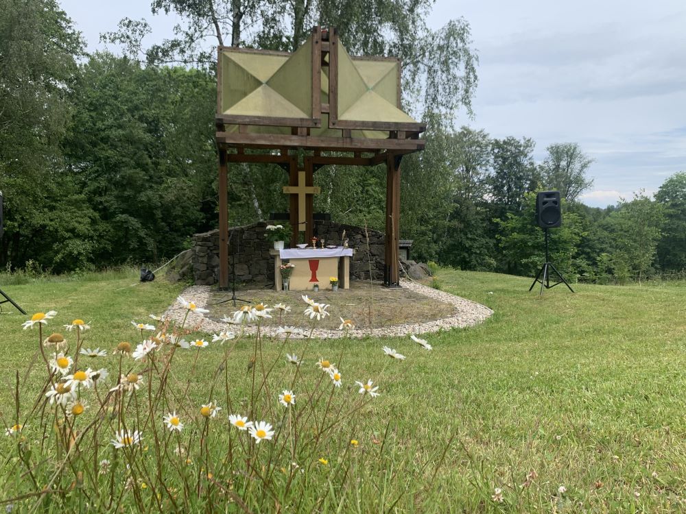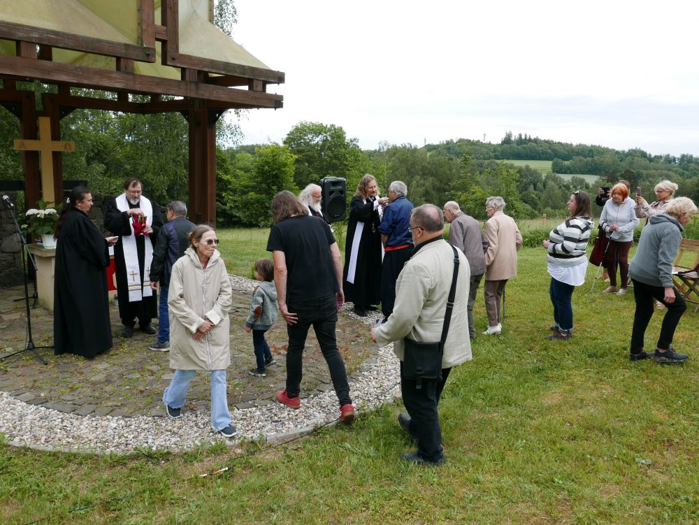 Tato a další slova, písně a modlitby, pak zazněla kromě nedávno postavené moderní kaple s motivem kříže také na místě Farského rodné chalupy a u sloupu s reliéfem patriarchy, které jsou součástí přírodního areálu.