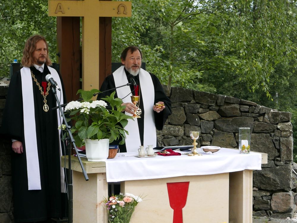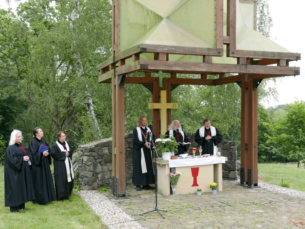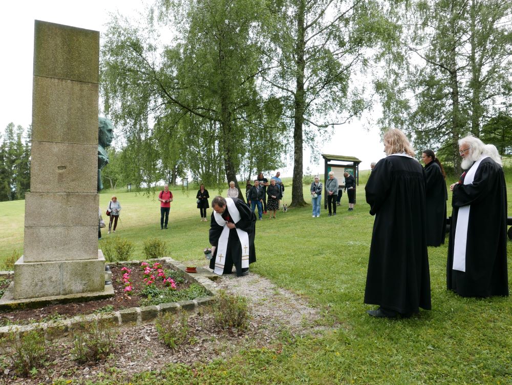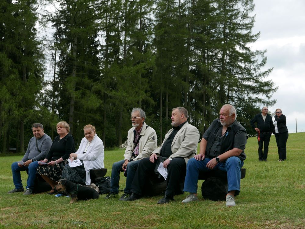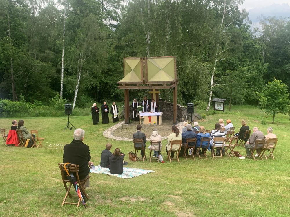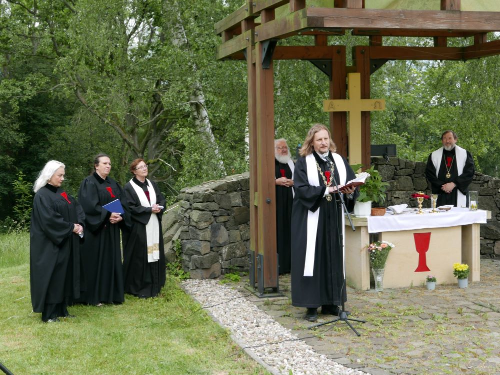 Tato a další slova, písně a modlitby, pak zazněla kromě nedávno postavené moderní kaple s motivem kříže také na místě Farského rodné chalupy a u sloupu s reliéfem patriarchy, které jsou součástí přírodního areálu.