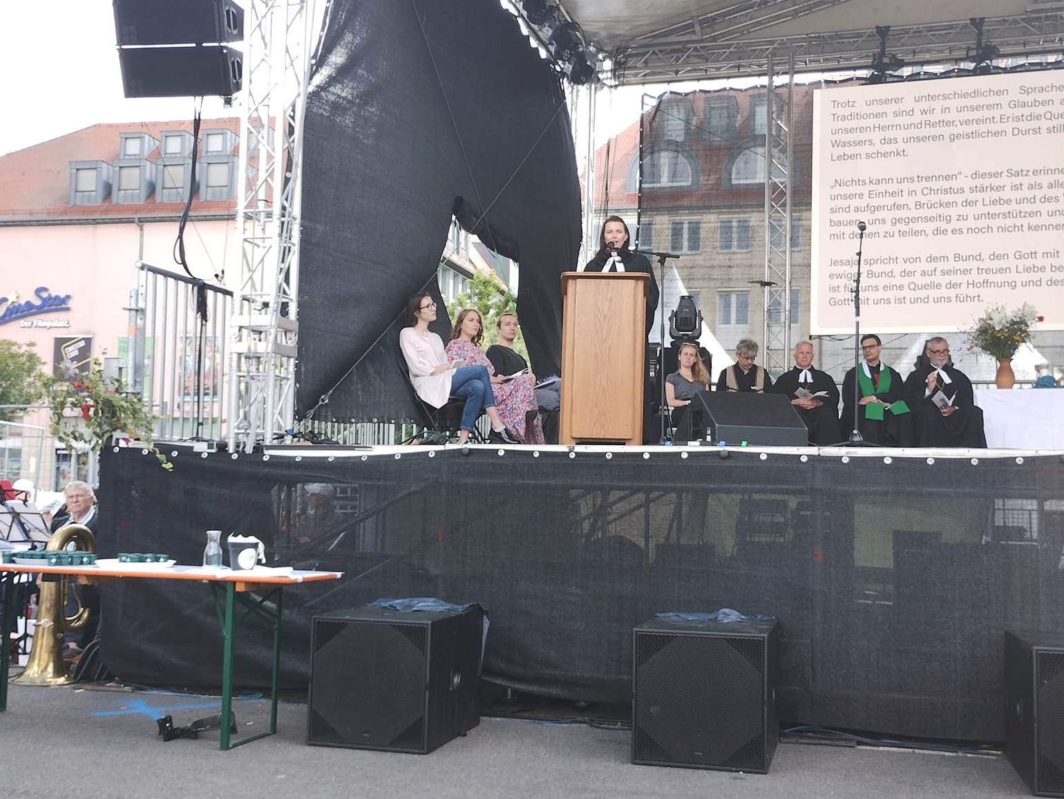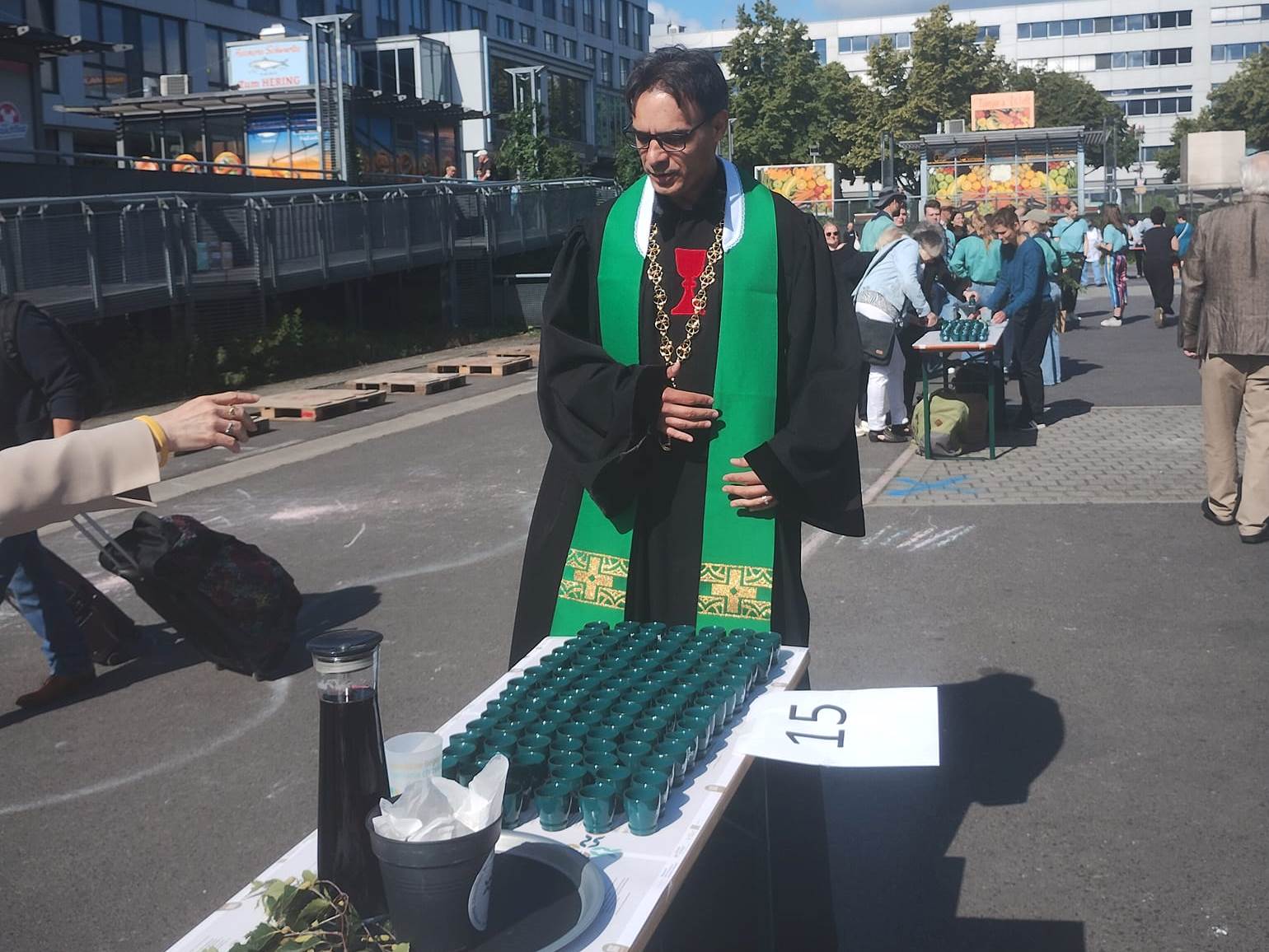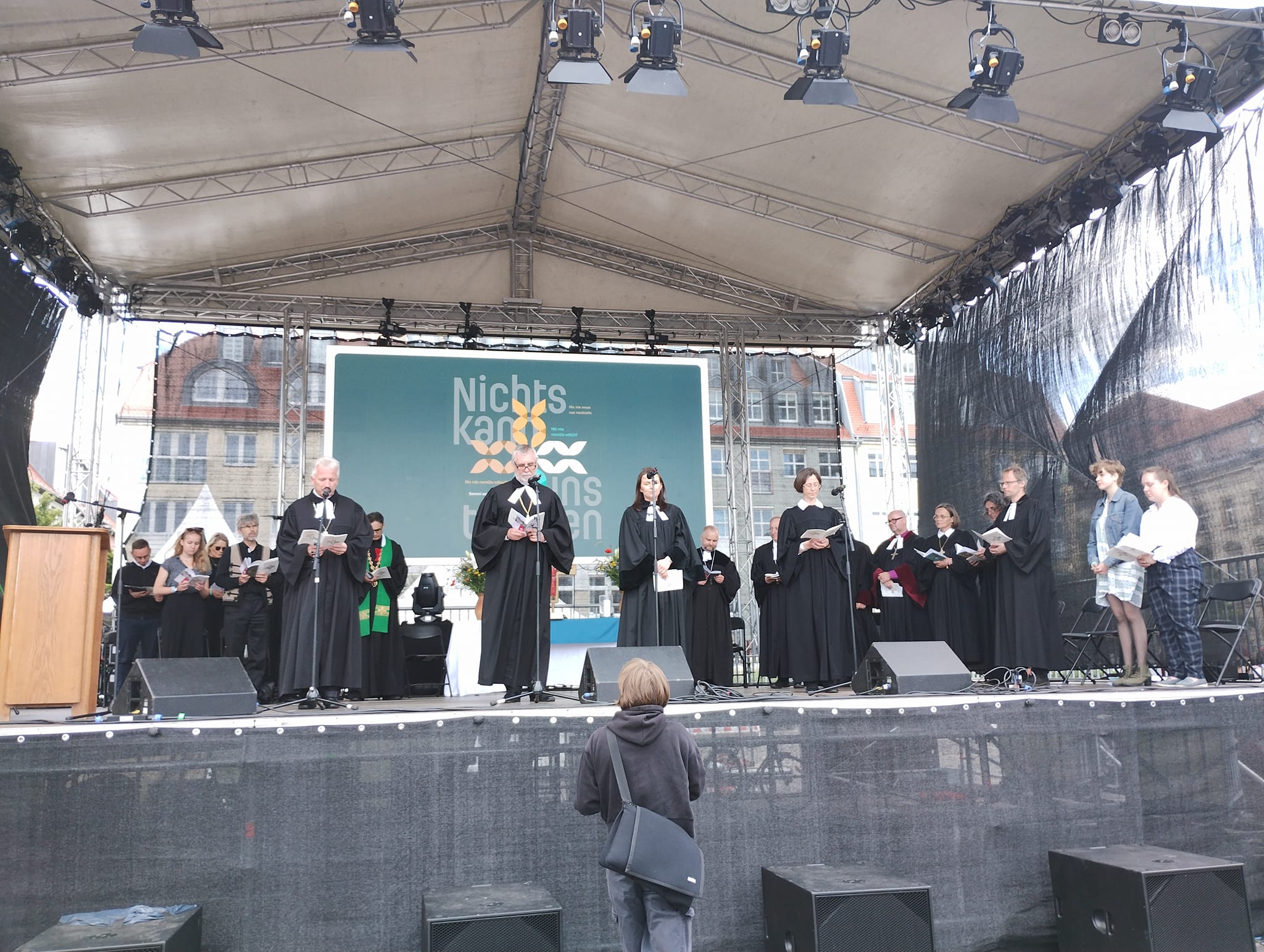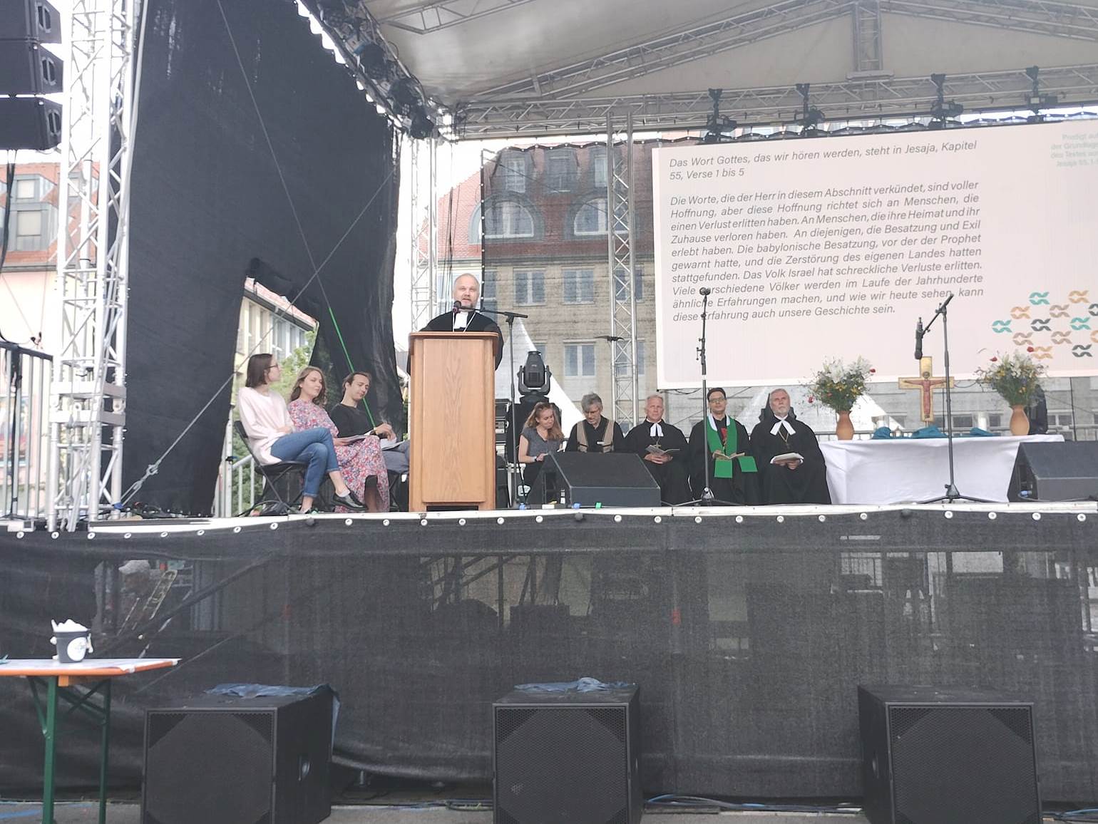 V pátek 7. 6. 2024 od 18.00 se konala úvodní bohoslužba na open-air pódiu na Brunnenplatz. Na liturgii se podíleli Dr. Theresa Rinecker, generální superintendentka. Kázali biskup Dr. Christian Stäblein (Berlín) a biskup Jerzy Samiec (Varšava - Polsko). Bohoslužbu doprovázel Frankfurtský ekumenický sbor a Kenya Musikprojekt (Nairobi - Keňa). Za naši církev se zúčastnila farářka Helena Smolová a biskup Lukáš Bujna a další věřící.