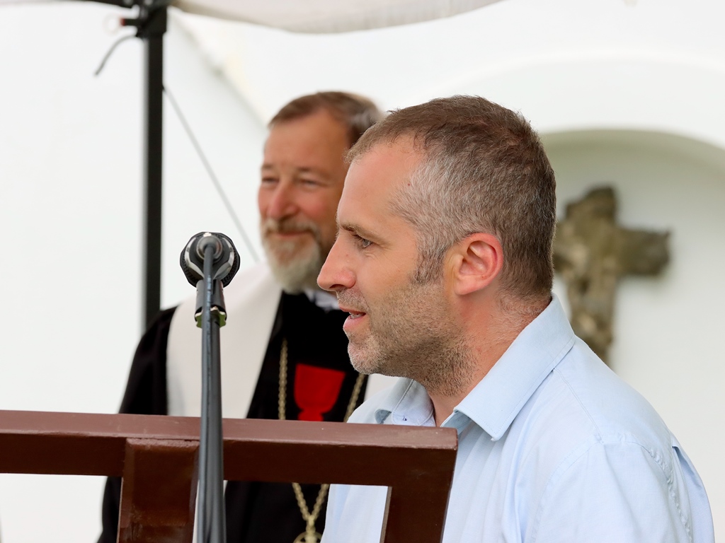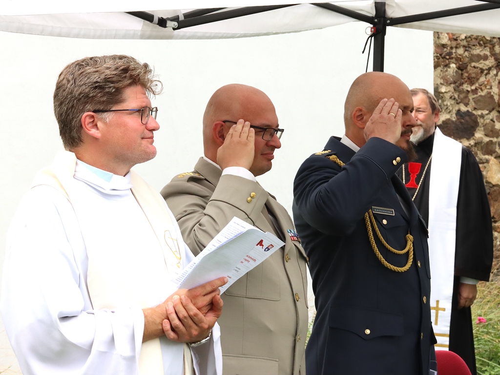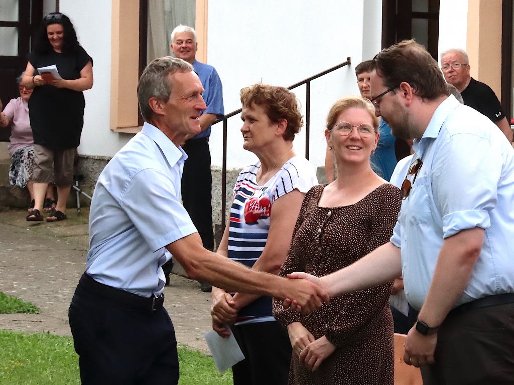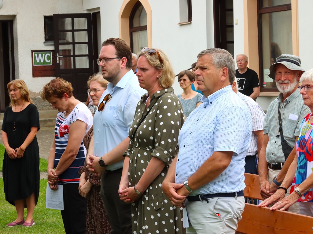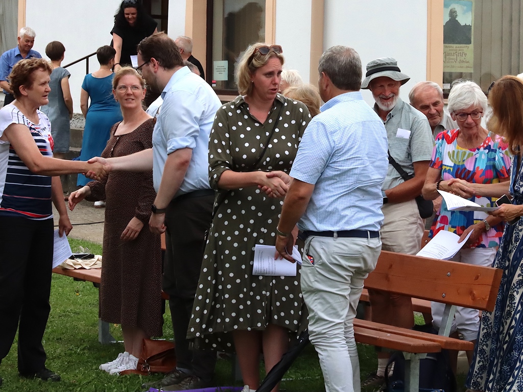 Odpoledne zakryly oblohu tmavé mraky a zpovzdálí se ozývalo hřmění, neboť po úmorném horkém a dusném počasí byly předpovídány silné bouřky. Přesto celá bohoslužba mohla podle pořadu proběhnout. Hned vedle Kurfürstova domu je „dům setkávání“ naší církve, který slouží pro dětské tábory a mládežové akce. Zde nalezli někteří z příchozích přístřeší v čase bouřky a prudkého deště, který se přihnal těsně po skončení této bohoslužby. Další program musel být z důvodu nepřízně počasí již zrušen. Dopoledne však proběhla řada akcí, včetně průvodu středověkých bojovníků městem v čele s Janem Žižkou, ukázky dobových řemesel nebo rekonstrukce dobývání hradu Ronov.