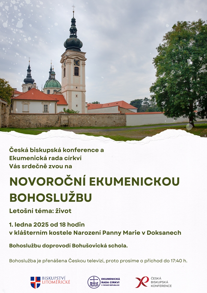 Česká biskupská konference a Ekumenická rada církví Vás srdečně zvou na Novoroční ekumenickou bohoslužbu, která se bude konat od 18.00 v klášternín kostele narození Panny Marie v Doksanech.