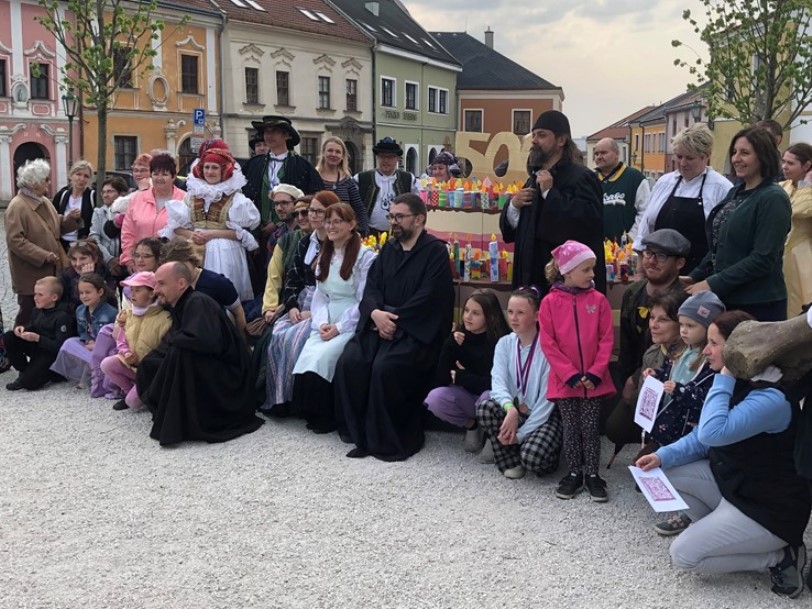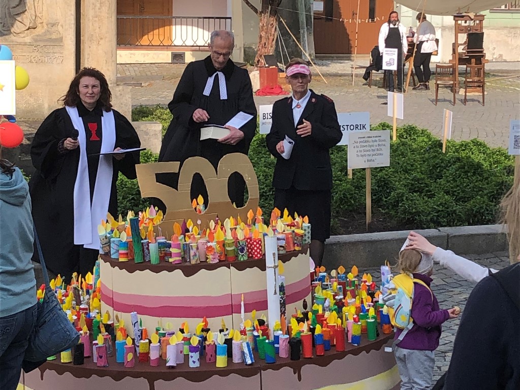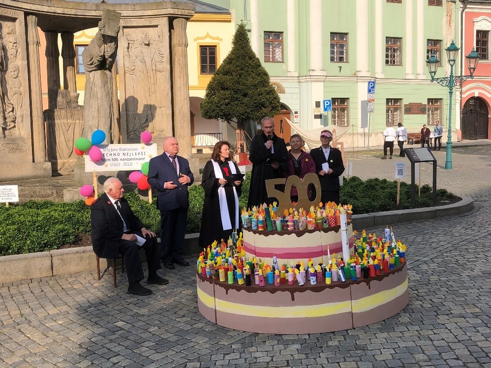 Účastníci vytvořili živý obraz s předáním narozeninového dortu, který měl 500 svící, vytvořených žáky ze základní školy v Přerově.