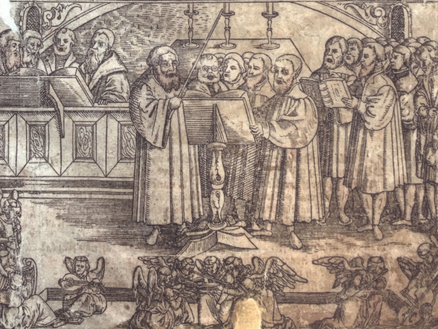 Individualizovaný portrét Jana Blahoslava (muž s brýlemi za pulpitem) uprostřed zpívajícího bratrského sboru; skupinový portrét, na němž je Blahoslav obklopen dalšími, neidentifikovanými bratrskými duchovními, byl otištěn na první straně tzv. Šamotulského kancionálu (Písně chval božských, Šamotuly: Alexandr Oujezdecký, 1561), zdroj: Marta Vaculínová, Martina Šárovcová, Alena Nachtmannová: Portréty předbělohorských intelektuálů, Praha: Academia, 2022, s. 366. Zdroj www.kniznice.cz