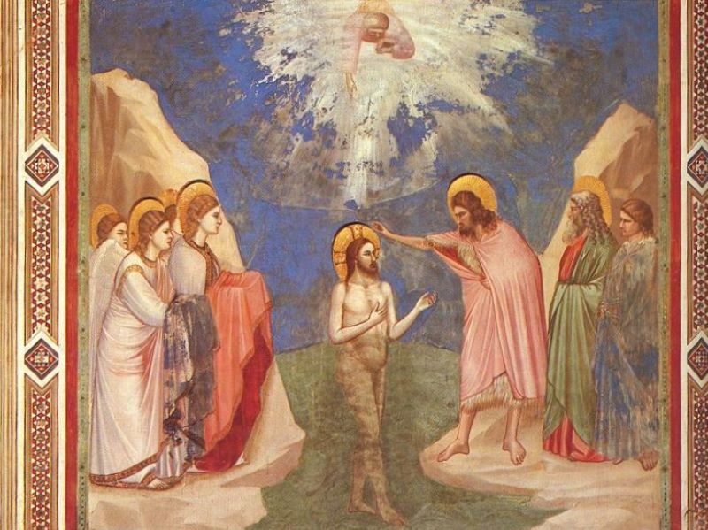 Obrázek: Giotto (1266–1337): Křest Kristův (1303), Kaple Scrovegni (Wikimedia Commons). Fotograf Giotto di Bondone.