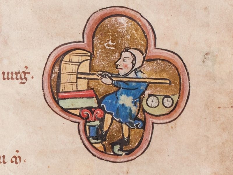 Obrázek: Pekař pečící chléb v peci – miniatura v žaltáři ze 13. století vyrobeném v Gentu. Z knihovny opatství Ten Duinen. Bruggy, Veřejná knihovna. Zdroj ZDE.