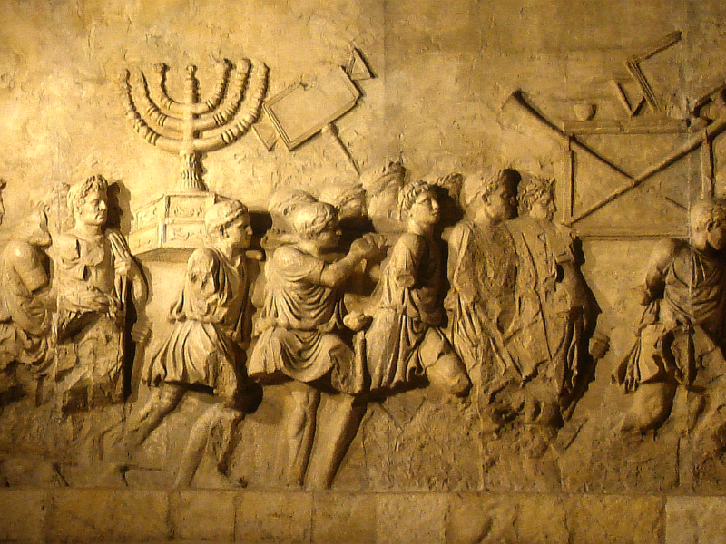 Obrázek: Kopie panelu římského triumfálního oblouku z Beth Hatefutsoth, zobrazující kořist z jeruzalémského chrámu. Wikimedia Commons (Creative Commons Attribution 3.0 Unported).