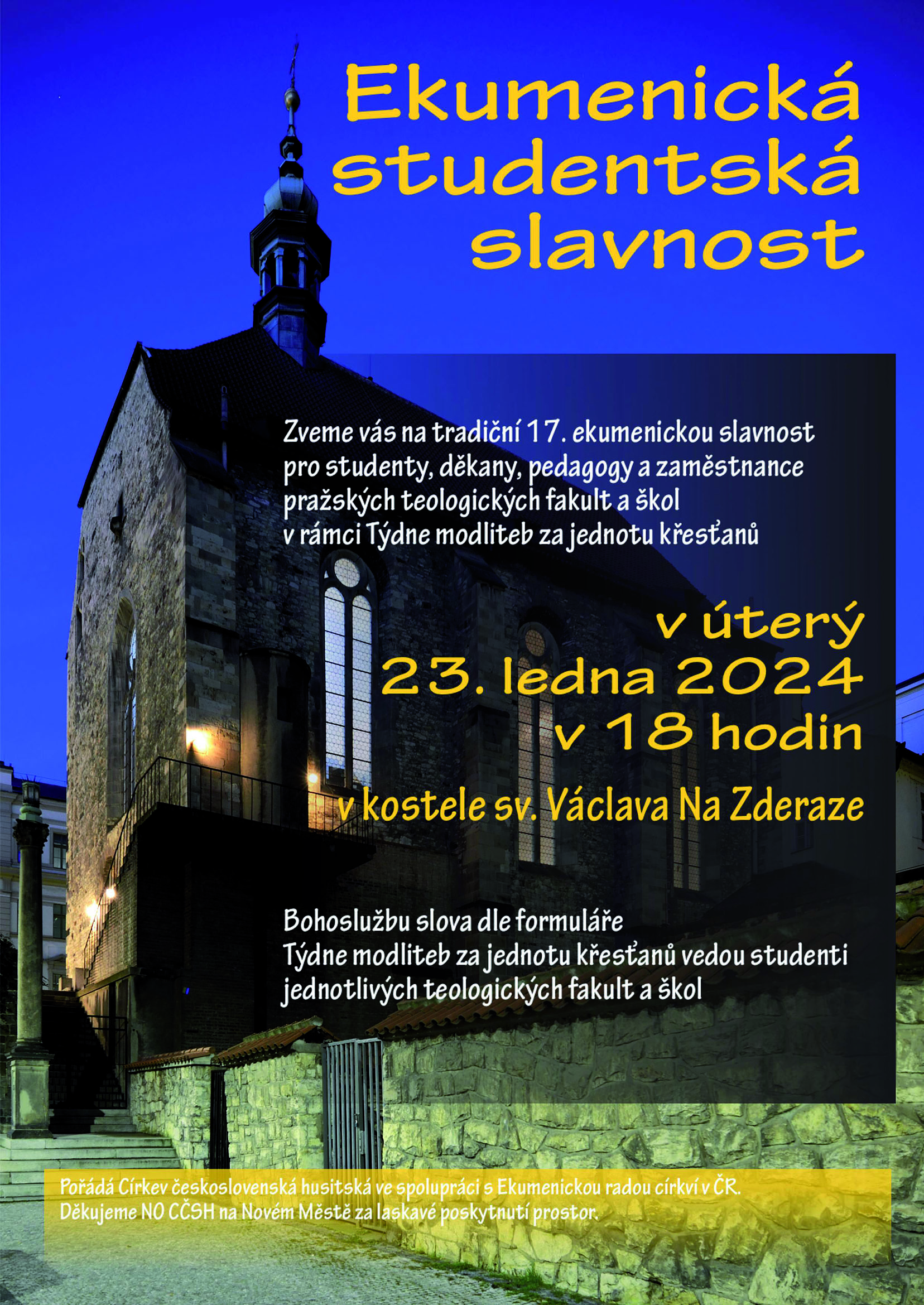 V rámci Týdne modliteb za jednotu křesťanů pořádá CČSH ve spolupráci s ERC ČR již 17. ročník Ekumenické studentské slavnosti v úterý 23. ledna 2024 od 18 hodin v kostele sv. Václava Na Zderaze.