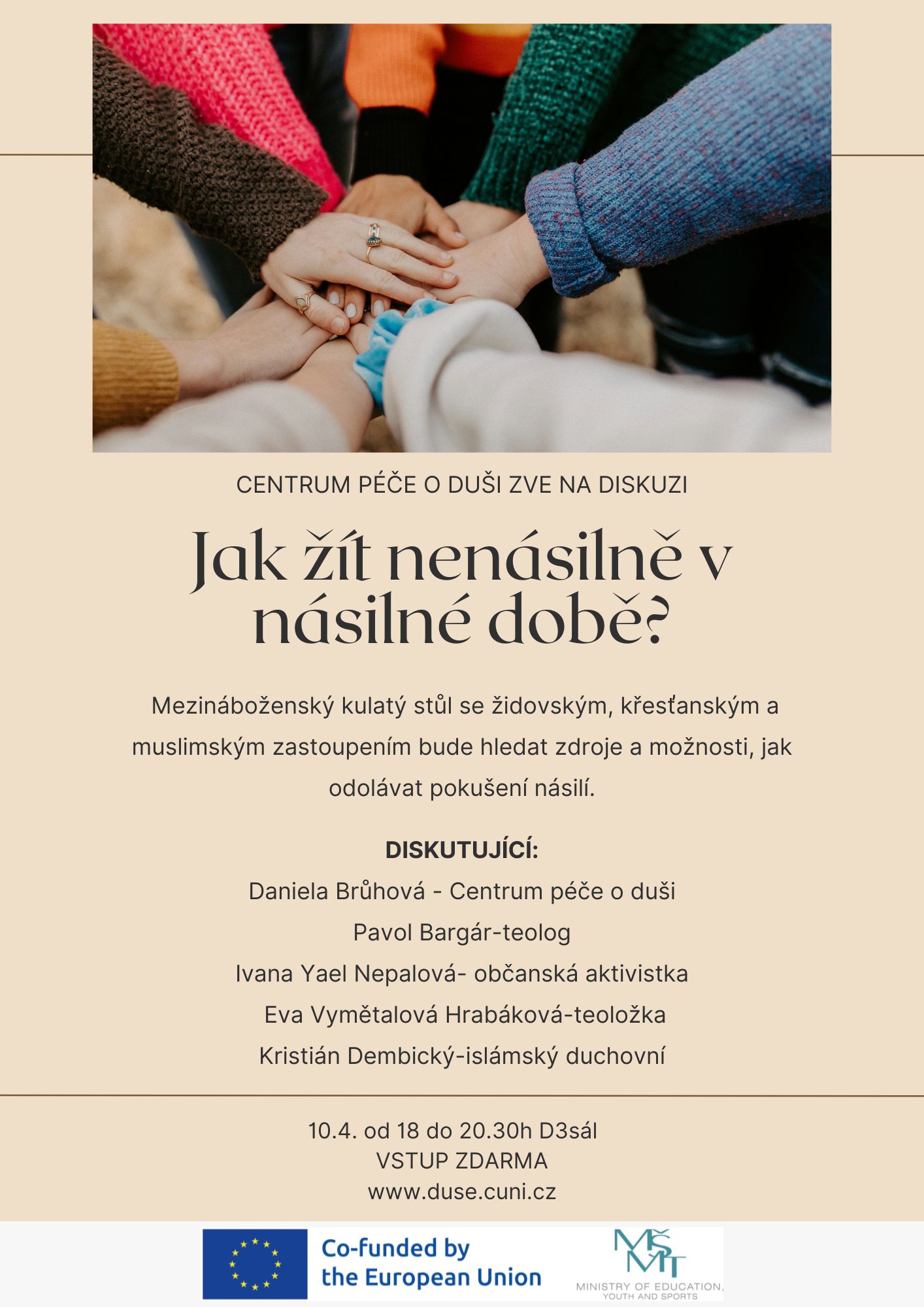 Centrum péče o duši vás zve na diskusi "Jak žít nenásilně v násilné době?", která proběhne ve středu 10. dubna 2024 od 18:00 do 20:30 hod. v Kampusu Hybernská (A3 sál). Vstup zdarma.