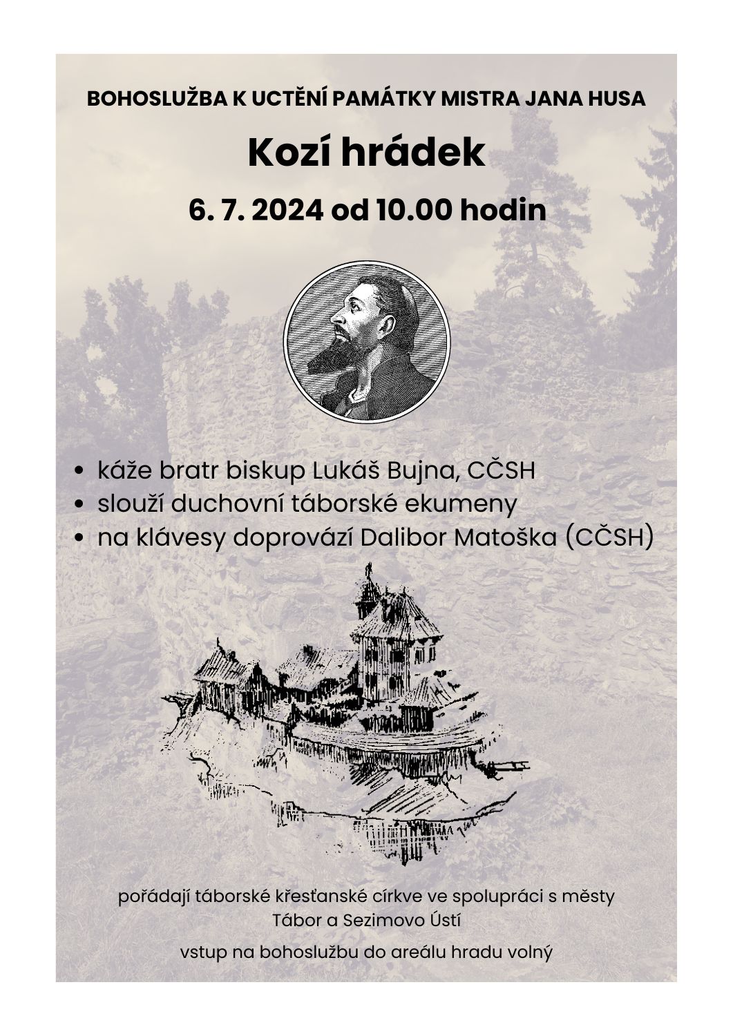 Srdečně zveme na bohoslužbu k uctění památky Mistra Jana Husa dne 6. 7. 2024 od 10 hodin na Kozím hrádku.
