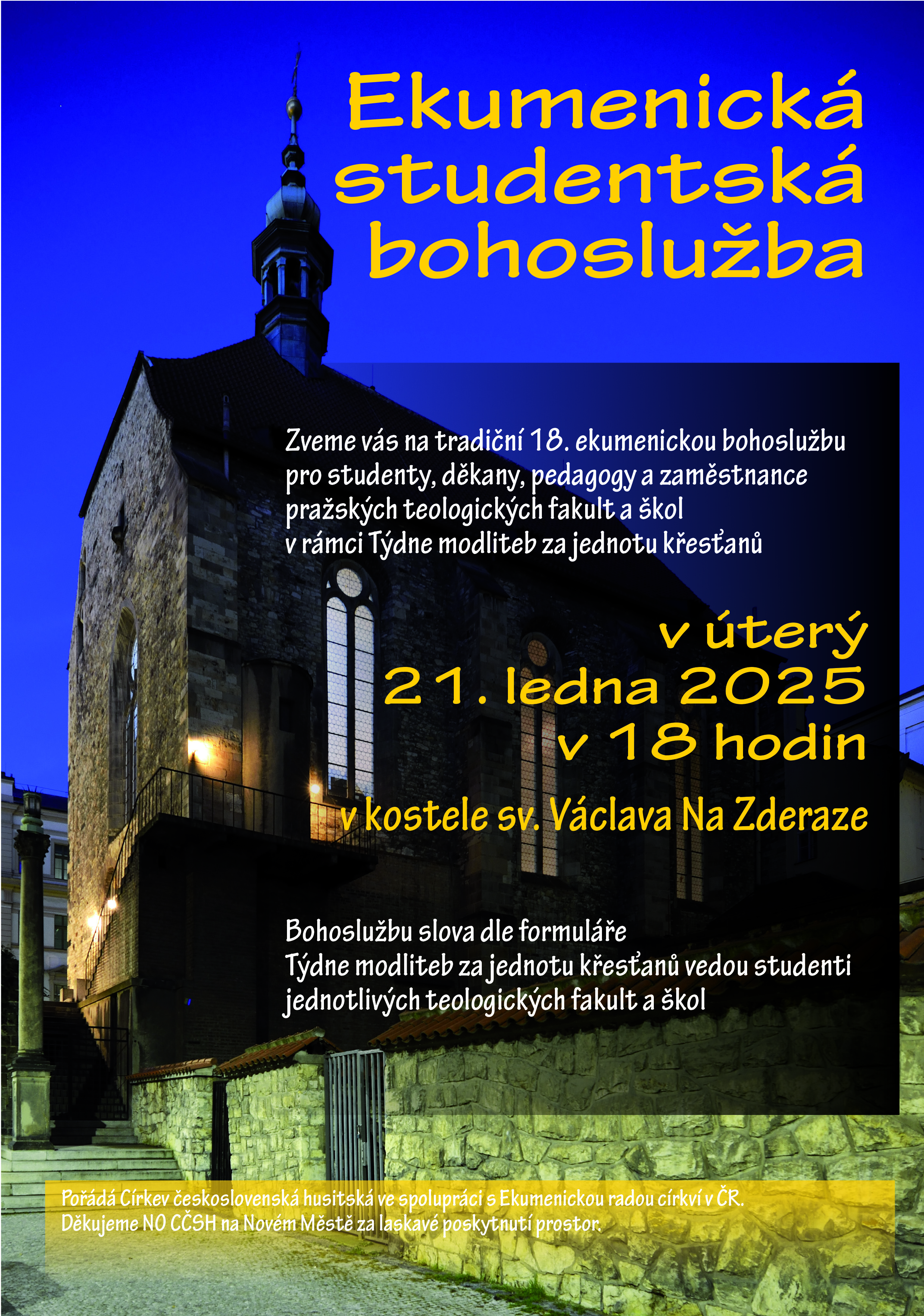 Úterý 21. ledna 2025, 18.00 – Studentská ekumenická slavnost (kostel sv. Václava na Zderaze).