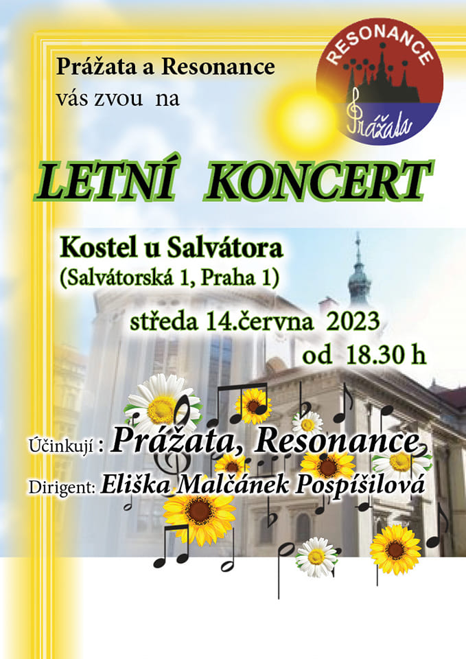 Letní koncert pěveckých souborů Prážata a Resonance se bude konat ve středu 14. června 2023 v kostele U Salvátora, Salvátorská 1, Praha 1. Diriguje Eliška Malčánek Pospíšilová. Začátek 18.30.