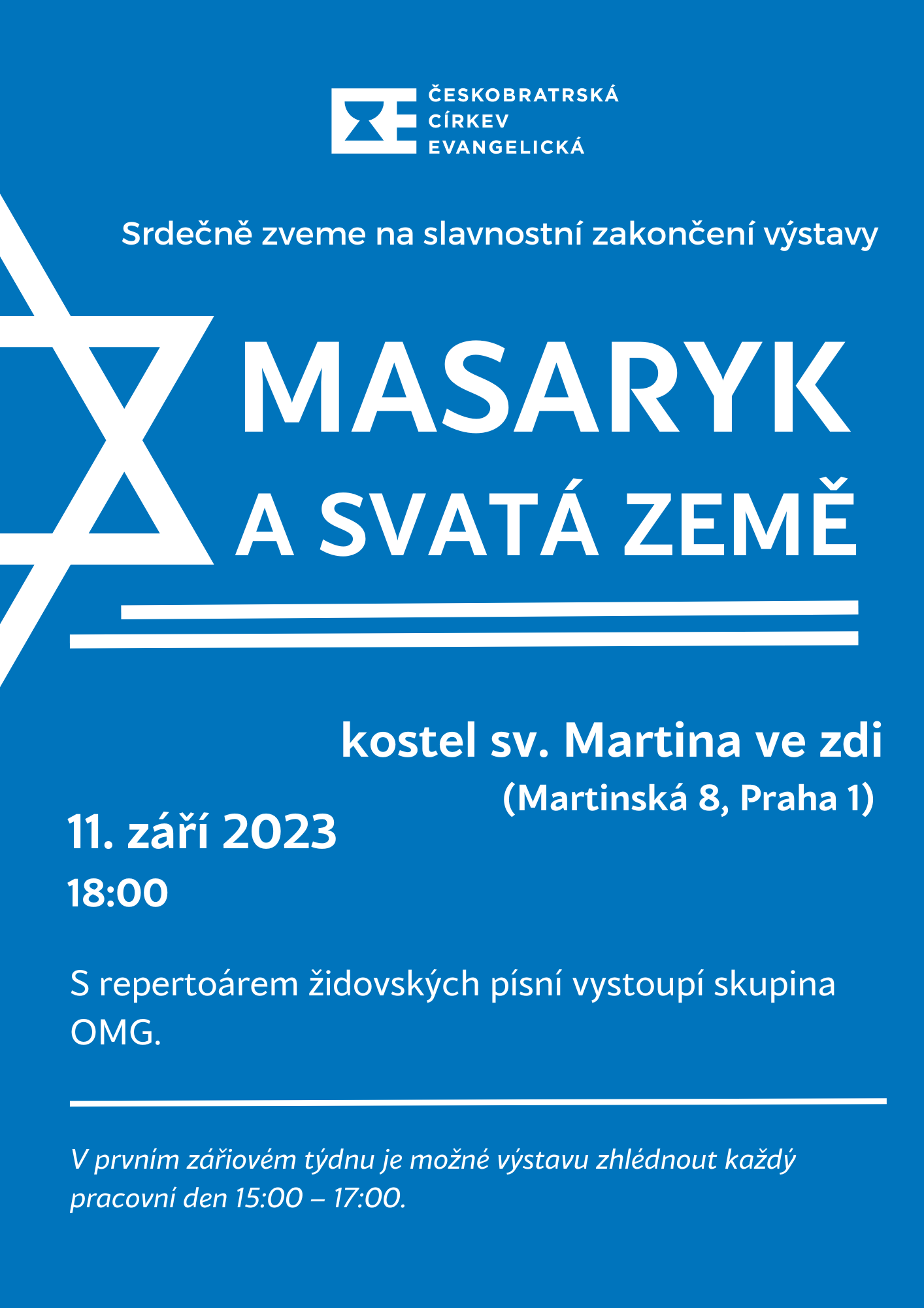 OMG vystoupí při slavnostním zakončení výstavy Masaryk a Svatá země s repertoárem židovských písní. Kostel sv. Martina ve Zdi, Martinská 8, Praha 1.