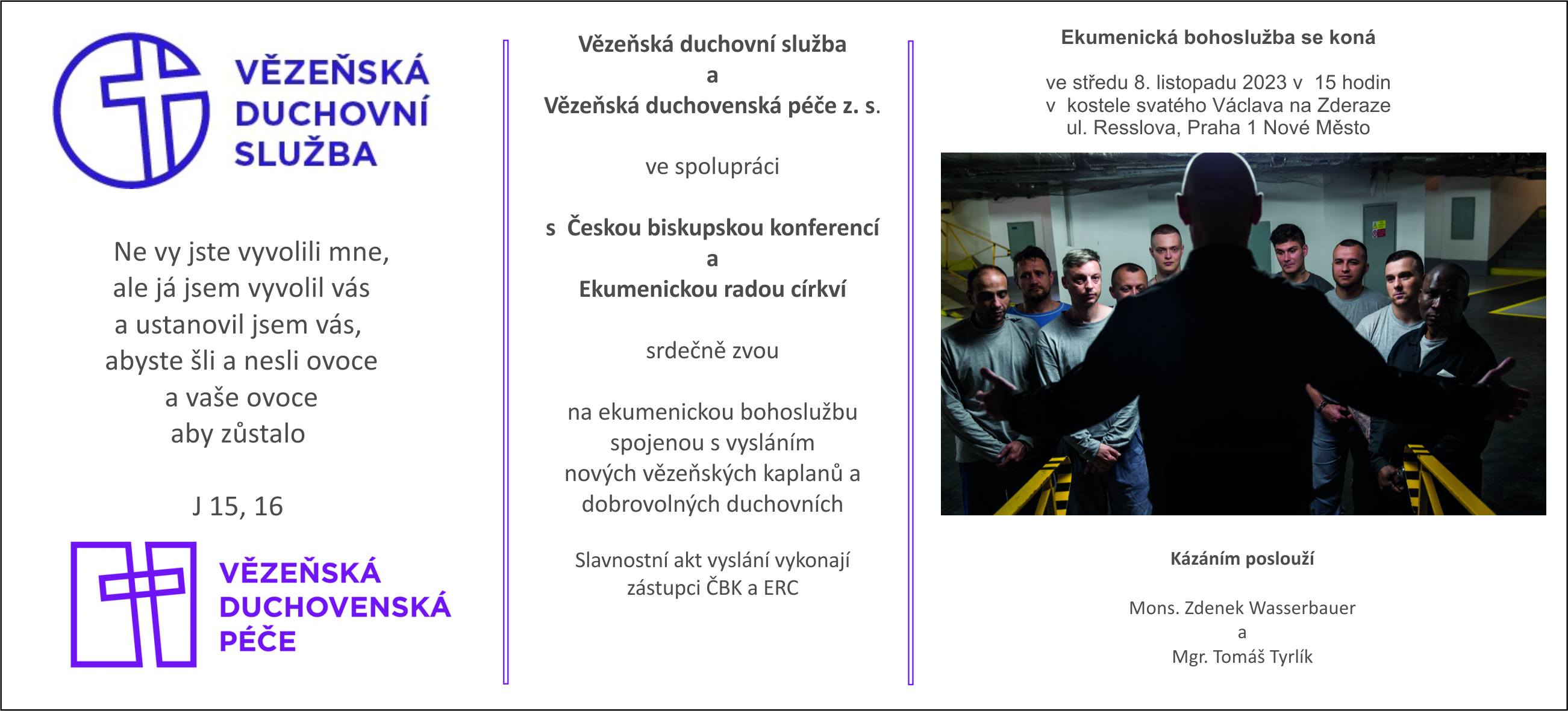 Ve středu 8.11.2023 v 15 hodin budou v kostele sv. Václava na Zderaze (Praha, Resslova 6) během ekumenické bohoslužby uvedeni do služby kaplani vězeňské duchovenské služby a dobrovolníci vězeňské duchovenské péče. Přijďte je podpořit!