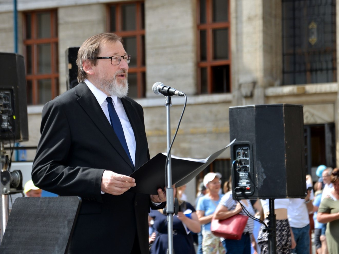Pozdrav patriarchy Tomáše Butty při vystoupení pěveckých sborů na Mariánském náměstí v Praze 8. června 2024.